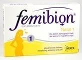 Działanie: Kwas foliowy - ważna witamina od momentu planowania ciąży do końca okresu karmienia piersią. Kwas foliowy to witamina z grupy B. Jest istotnym elementem procesu podziału komórek i tworzenia się krwi, a przez to jest współodpowiedzialny za prawidłowy rozwój tkanek. Badania naukowe w dziedzinie żywienia wykazały pozytywny wpływ kwasu foliowego na przebieg ciąży. Zapotrzebowanie na foliany/kwas foliowy zwiększa się w okresie ciąży. trudno jest zgromadzić odpowiednie rezerwy folianów w organizmie, dlatego tak ważne jest ich regularne przyjmowanie w okresie ciąży. Metafolina - gotowa do wykorzystania przez organizm i lepiej przyswajalna forma folianu. Kwas foliowy jest dopiero w organizmie przekształcany do swojej biologicznie aktywnej formy. Natomiast metafolina jest biologicznie dostępną formą folianu. Dzięki temu jest substancją odżywczą gotową do bezpośredniego wykorzystania przez organizm i jest lepiej przyswajalna niż kwas foliowy. Femibion Natal 1 zawiera 400 mikrogramów kwasu foliowego i taką samą ilość metafoliny. Dzięki temu połączeniu można osiągnąć odpowiedni poziom folianów/kwasu foliowego w komórkach w ciągu 4 tygodni codziennego przyjmowania. Już w okresie planowania ciąży kobieta powinna zadbać o odpowiednio wysokie zaopatrzenie organizmu w kwas foliowy i metafolinę. Umożliwi to zaspokojenie zwiększonego zapotrzebowania na samym początku ciąży. Między 22. a 28. dniem od poczęcia rozwija się mózg i rdzeń kręgowy oraz zamyka się cewa nerwowa u dziecka. W tym czasie większość kobiet nie jest jeszcze świadoma, że jest w ciąży. Dlatego Femibion Natal 1 zawiera 400mikrogramów kwasu foliowego i taką samą ilość metafoliny, żeby zapewnić zapotrzebowanie od samego początku nawet u tych kobiet, których organizm nie jest w stanie w optymalny sposób przetwarzać kwasu foliowego. Inne istotne witaminy oraz jod: Femibion Natal 1 zawiera dodatkowo 9 ważnych witamin oraz jod pomagający uzupełnić niedobory i pokryć zwiększone zapotrzebowanie na te składniki. Witamina B1 jest potrzebna w procesie przemiany węglowodanów i pozyskiwania energii. Witamina B2 odgrywa ważną rolę w całym procesie przemiany materii. Witamina B6 reguluje proces przemiany białek oraz bierze udział w podziałach komórek. Witamina B12 jest ważna w procesie tworzenia się krwi. Witamina C uczestniczy w tworzeniu kolagenu. Witamina E chroni komórki i tkanki ciała. Biotyna jest ważna dla zdrowej cery, włosów i paznokci. Kwas pantotenowy uczestniczy w procesach tworzenia energii. Niacyna wzmacnia ochronną rolę skóry. Jod jest ważnym składnikiem mineralnym diety.