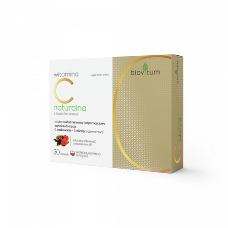 BIOVITUM NATURALNA WITAMINA C to wysokiej jakości suplement diety, który stanowi bogate źródło naturalnej witaminy C, pochodzącej z wyciągu z owoców aceroli (Malpighia glabra L.). Witamina C (kwas L-askorbinowy) wspiera funkcjonowanie układu odpornościowego i nerwowego; uczestniczy w prawidłowym przebiegu funkcji psychicznych, przyczynia się do utrzymania prawidłowego metabolizmu energetycznego oraz zwiększa wchłanianie żelaza w organizmie. Witamina C wspiera także ochronę antyoksydacyjną organizmu, uczestniczy w procesie produkcji kolagenu wspierając prawidłowe funkcjonowanie naczyń krwionośnych. Preparat Biovitum Naturalna Witamina C uzupełnia codzienną dietę w wysokiej jakości naturalną witaminę C.