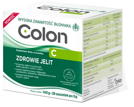 - Colon C to suplement diety w proszku zawierający łupine nasienną babki jajowatej (Plantago ovata), inulinę z cykorii (Cichorium intybus) oraz bakterie z rodzaju Lactobacillus acidophilus i Bifidobacterium lactis.