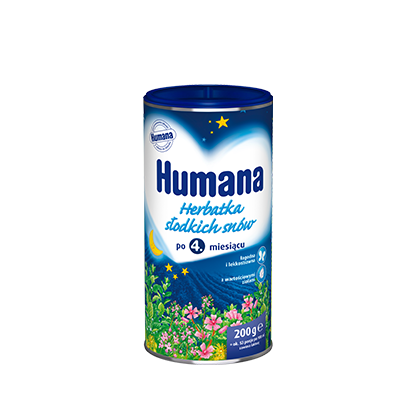 Herbatka słodkich snów Humana jest smacznym, gaszącym pragnienie napojem, dostosowanym do potrzeb dzieci po 4. m życia. Jego pyszne składniki, będące kompozycją wyciągów z ziół, takich jak: melisa, kwiat malwy, kwiat lipy i tymianek, są znane z przynoszącego ulgę i uspokajającego działania.