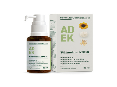 - Olejek Formula CannabiGold „WITAMINA ADEK” to suplement diety z witaminami A, D, E i K w oleju z nasion konopi. Posiada szerokie spektrum działania, między innymi wspiera układ odpornościowy,