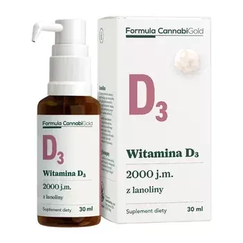 Formula CannabiGold Witamina D3 z lanoliny - suplement diety dostarczający witaminę D3, która została pozyskana z lanoliny. Produkt ma formę oleju rozpylanego w jamie ustnej. Cholekalcyferol w Formule CannabiGold Witamina D3 z lanoliny został rozpuszczony w oleju z nasion konopi włóknistych. Produkt przeznaczony dla osób dorosłych.