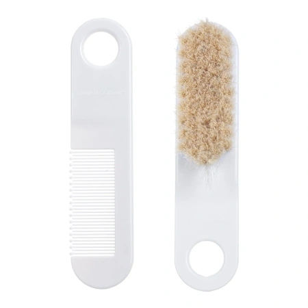 - Szczotka do włosów z naturalnego, miękkiego włosia w zestawie z grzebykiem do codziennej pielęgnacji włosów dziecka.