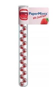 - PaperMints Cool Caps Kulki o smaku truskawkowo-miętowym – wewnątrz kapsułki znajdują się dwa płynne składniki, które zapewniają bardzo długotrwałe uczucie orzeźwienia i świeżego oddechu.