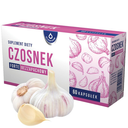Czosnek forte bezzapachowy zawiera w swoim składzie macerat olejowy z czosnku standaryzowany na 2% zawartość alliiny. Czosnek (Allium sativum L.) wspiera prawidłowe funkcjonowanie układu odpornościowego. Ponadto wspomaga pracę serca oraz utrzymanie prawidłowego poziomu cholesterolu we krwi.