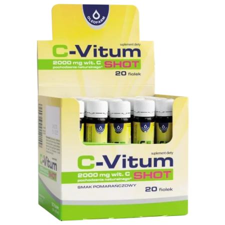 - C-Vitum SHOT to suplement diety w płynnej formie, o smaku pomarańczowym, zawierający witaminę C pochodzenia naturalnego - z ekstraktu z owoców dzikiej róży. Witamina C pomaga w prawidłowym funkcjonowaniu układu odpornościowego oraz nerwowego.