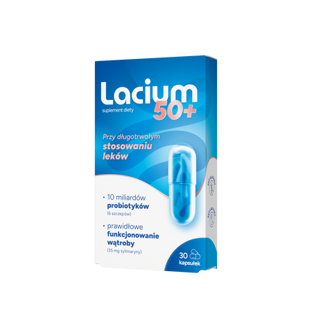 - Lacium 50+ to suplement diety zawierający unikalną kompozycję 6 wyselekcjonowanych szczepów bakterii probiotycznych oraz sylimaryny. Jest to produkt dopasowany do potrzeb osób po 50 roku życia. Nie zawiera glutenu ani laktozy.
